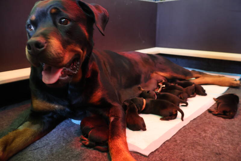 Moeder en puppy's stellen het goed.